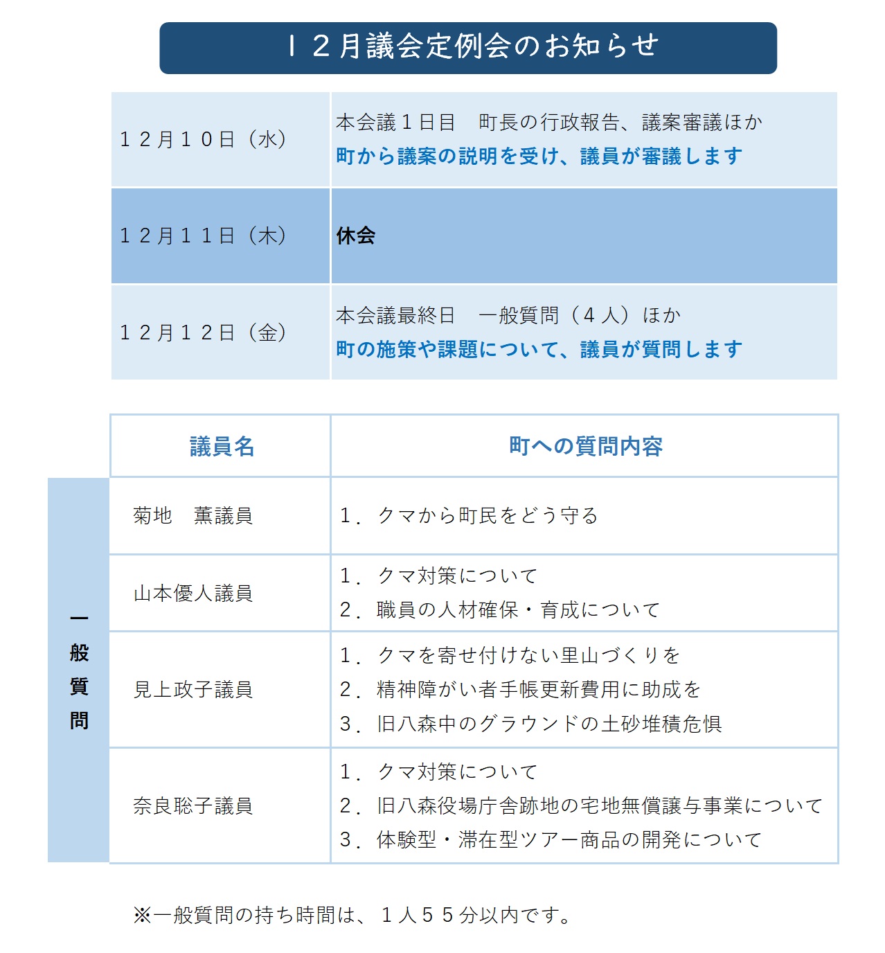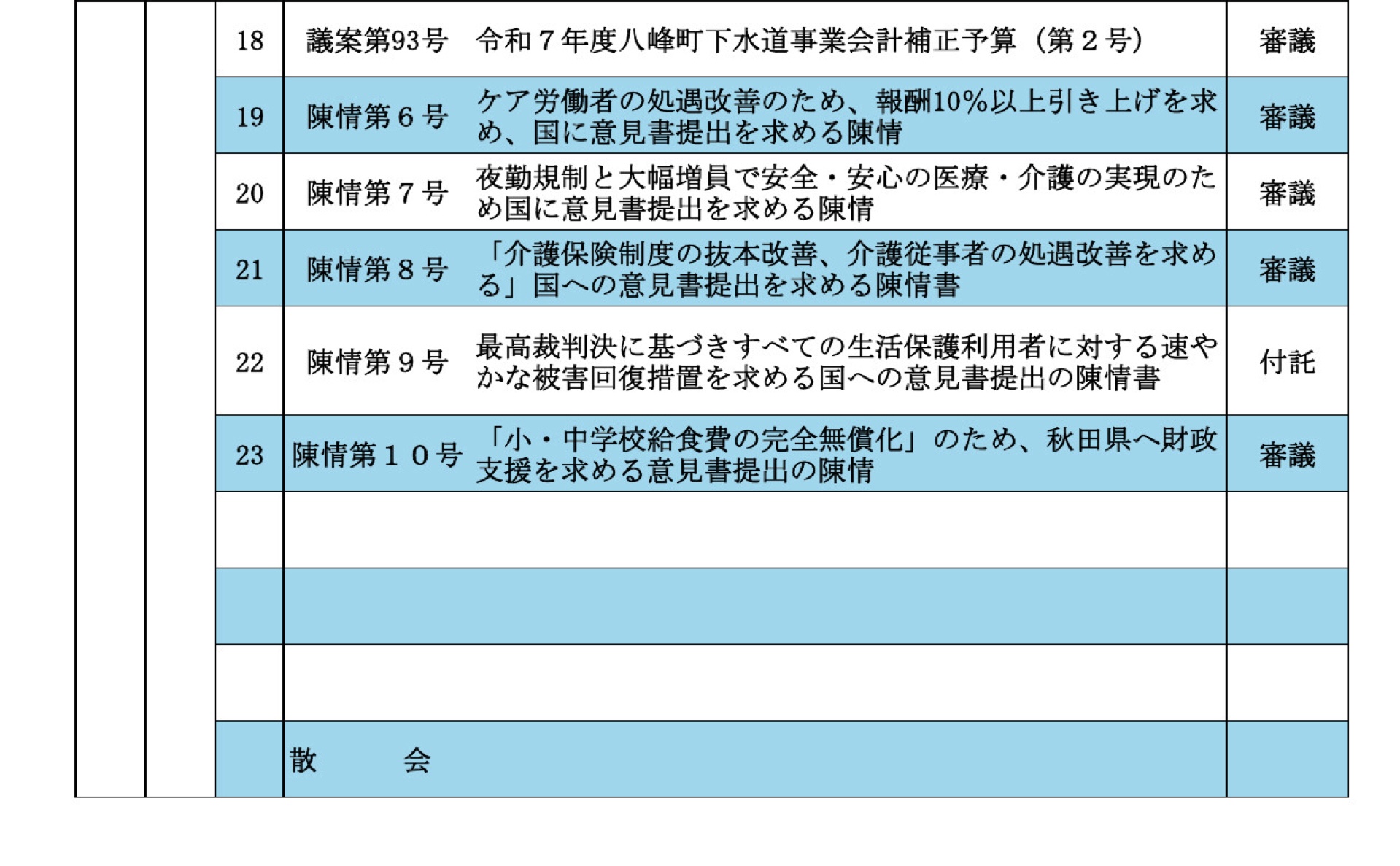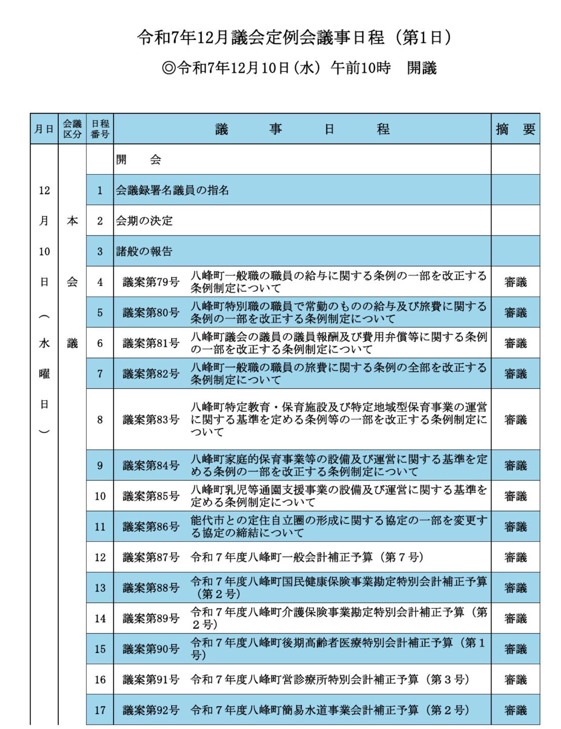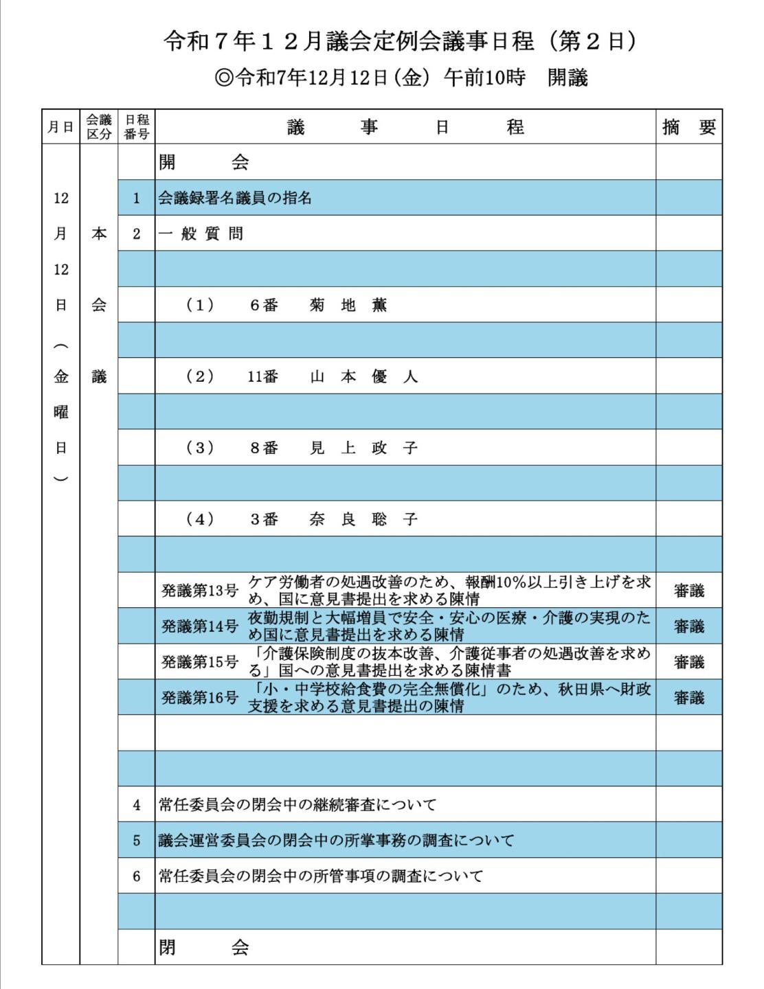議会日程 2025年12月02日 記事ID: 1978 令和7年12月議会定例会を開催します 日 時 12月10日(水)~12日(金) 午前10時開会 会 場 役場2階 大会議室 その他 本会議はどなたでも傍聴できます。傍聴を希望される方は、大会議室入り口の受付簿の記入をお願いします。 お問い合わせ先 議会事務局 電話番号:0185-76-4607 FAX:0185-76-2203 メールでのお問い合わせ このページの現在位置 属性 お知らせ くらしの情報 行政情報 議会 組織 議会事務局 お知らせ
